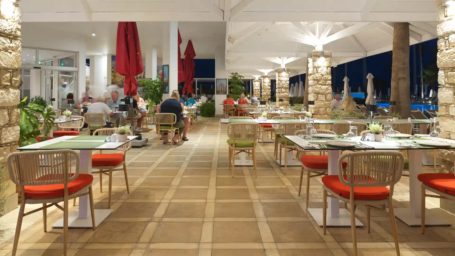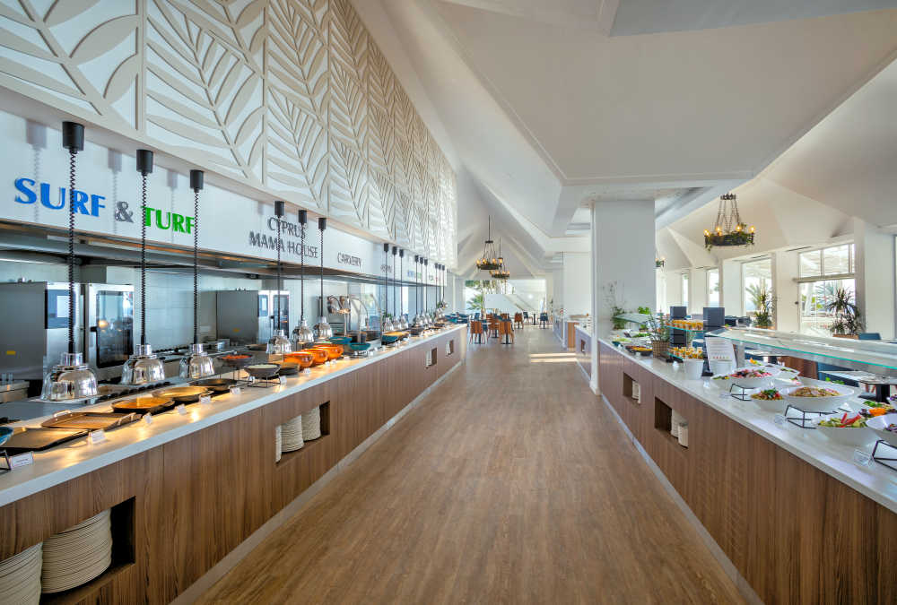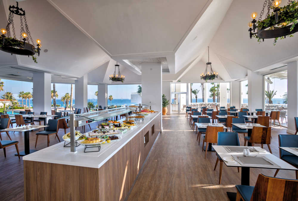 An elegant restaurant, bathed in natural light that comes in through ample floor-to-ceiling windows, overlooking the resort’s exotic gardens and the dazzling Mediterranean Sea, the Blue Horizon Restaurant is open for buffet-style breakfast, lunch, and dinner. There’s a generous salad buffet and a live cooking counter with chefs preparing warm meals. Delicious local and international desserts are lined up in a buffet area where you can eat as much as you. You’ll love the food, the atmosphere, the service, and the views.