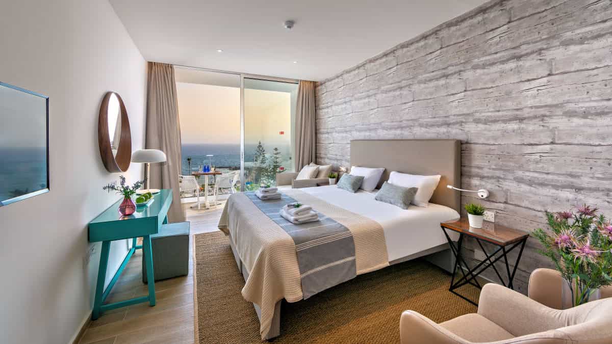 The room is very spacious with a bathroom with large walk-in shower, ample closet space with mini fridge and coffee facilities opening to a large bedroom, a small seating area with a bespoke natural wood desk alcove separated by perforated screens and the addition of a sofa bed and small table. TV on the wall and vanity mirror, hair dryer and comfortable armchairs open to a balcony with small seating area allowing the guest to enjoy the views to the sea and the sunsets, to watch the mingle of locals and tourists walk on the sea front promenade. Room can accommodate up to 3 guests.